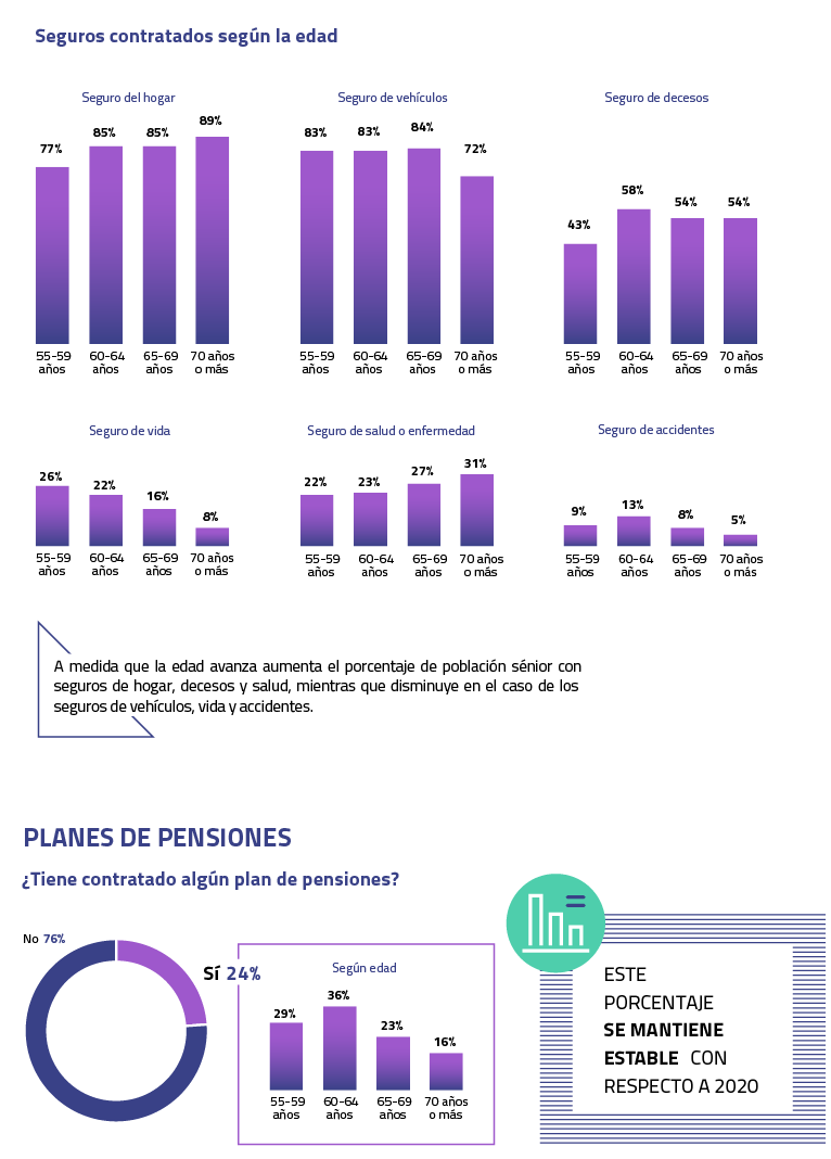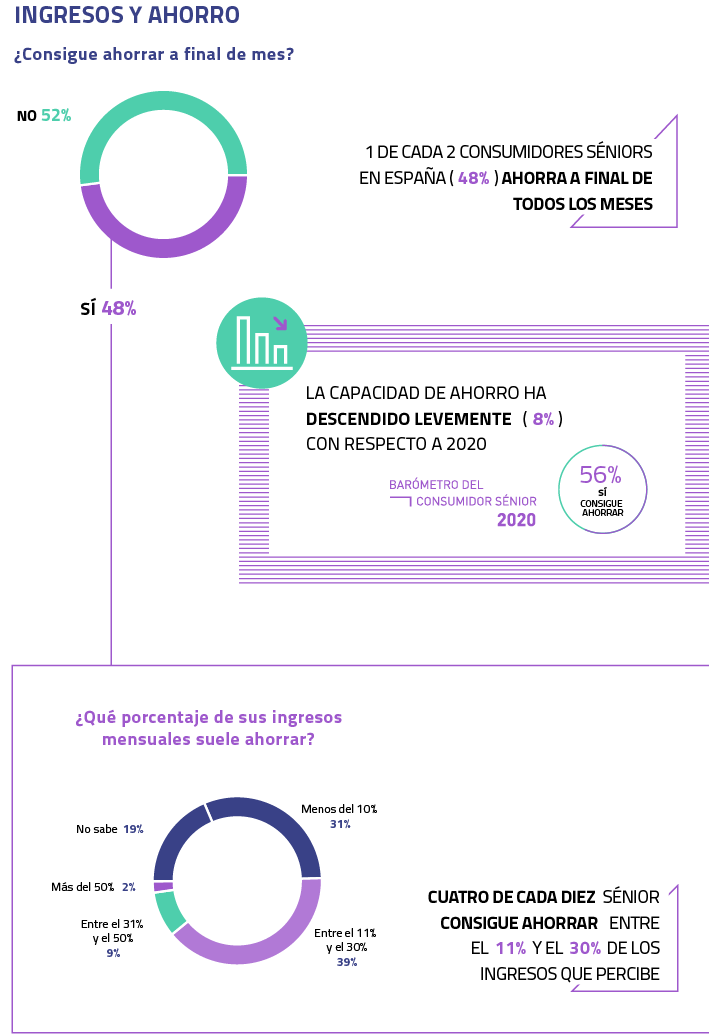 La crisis sanitaria y económica no ha alterado estructuralmente la base del consumo sénior. Aspectos clave como el pago de hipotecas, el número de planes de pensiones contratados o el porcentaje de españoles mayores de 55 años que cuenta con un seguro se mantiene con respecto a 2020, en un contexto en el que la mitad del segmento sigue teniendo capacidad de ahorro cada mes.