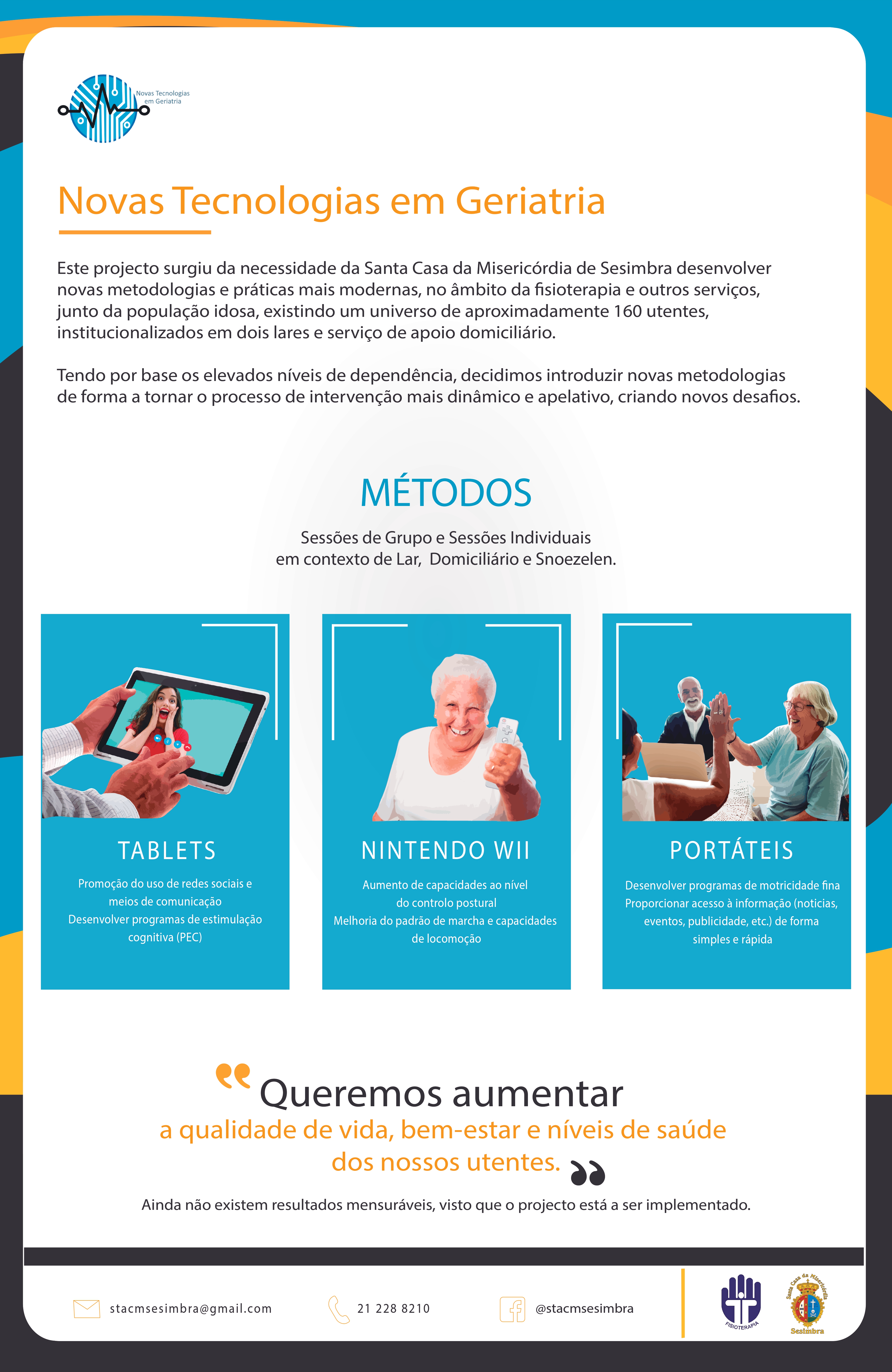 El mismo consiste en la integración de nuevas tecnologías, como la Nintendo Wii, ordenadores portátiles y tablets en el proceso de intervención de nuestros usuarios, tanto en nuestras Estructuras Residenciales para Mayores (Lar Sr. Jesus das Chagas y Lar Santiago - Sesimbra, Portugal) como en el servicio de Fisioterapia y Apoyo a Domicilio, así como en nuestra sala "Espacio Sentido" y en el Gabinete de Psicología de Snoezelen en Santana (Sesimbra, Portugal), con los diversos servicios también abiertos a la comunidad local.