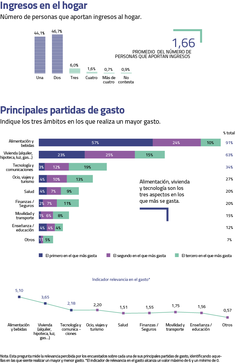 Los consumidores sénior en España tienen de media más de una fuente de ingresos por hogar. Sus partidas prioritarias de gasto se mantienen estables en el tiempo, siendo la alimentación, la vivienda y la tecnología aquellas en las que más invierten en todos los segmentos registrados. Además, una mayoría se muestra moderadamente optimista con respecto a su situación económica en el futuro, al considerar que permanecerá más o menos igual que antes de la crisis.
